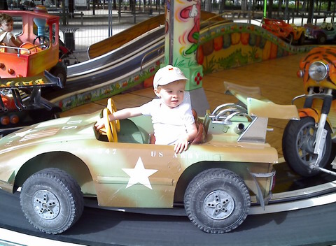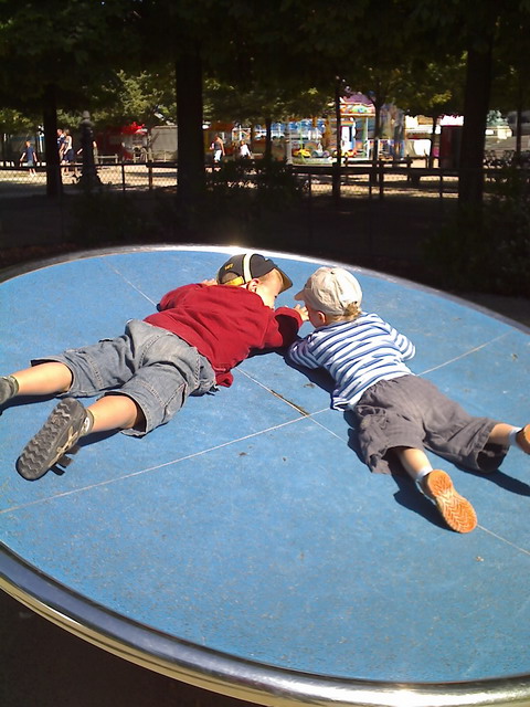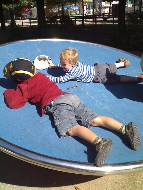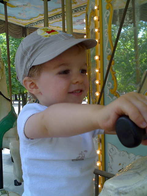 On continue notre ballade, il aperçoit des jeux pour enfants. Et il fait la conversation tout seul : « là ? là, maman ? oui, oui ? d’accord, d’accord » et c’est parti pour 1/2 heure de tourniquet non stop. Même pas vomi !! 😀