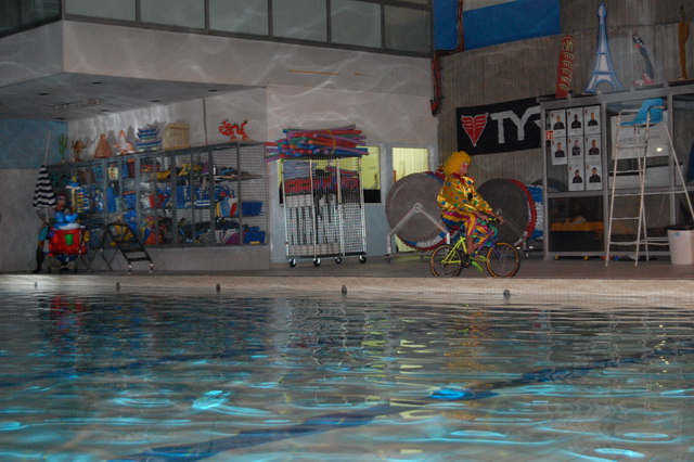 Kelyan a peur des clowns, il a les larmes aux yeux et se réfugie dans mes bras. C’est assez rare pour le souligner. Le son est vraiment très fort alors entendre les clowns hurler, ça ne doit pas aider. Il ne rit même pas quand ils sautent à l’eau avec un vélo ou un caddie.