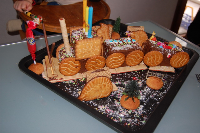 Et puis il y a aussi le gâteau-train (ou le train-gâteau). Presque le même que celui de l’année dernière car devant tant de sollicitude de la part des convives l’an passé, il a fallu réitérer en variant quelque peu :