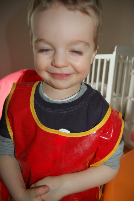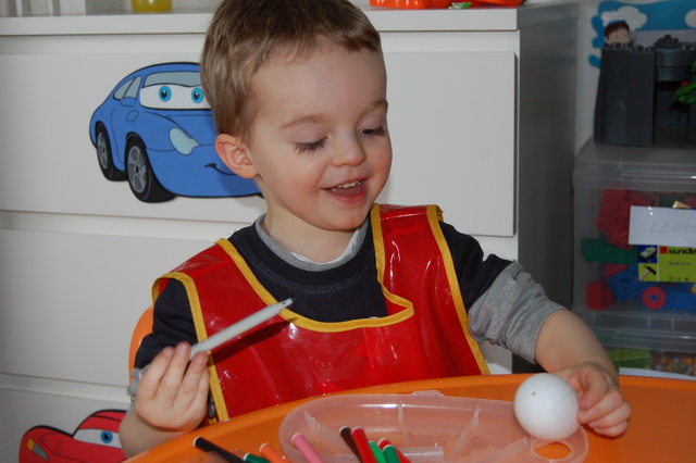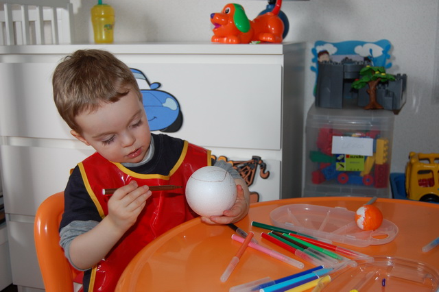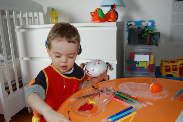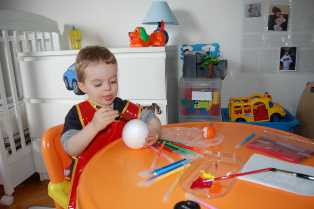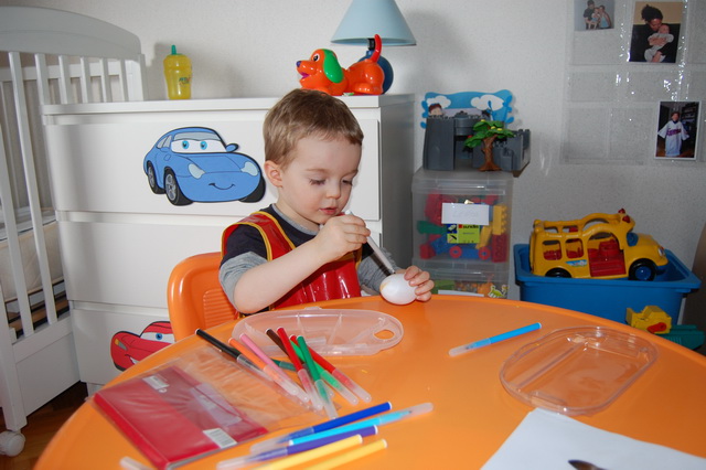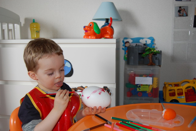 Et de se préparer pour Pâques qui arrive bientôt. Direction le Monop juste à côté pour se munir en gouache pendant que Tibo cuve fait une grasse mat’ bien au chaud sous la couette. Nous rentrons à la maison délestés de 13€ seulement. Oui, on a fait l’erreur d’acheter aussi des feutres et des sacs poubelles. Comment ça le pouvoir d’achat a baissé ?…