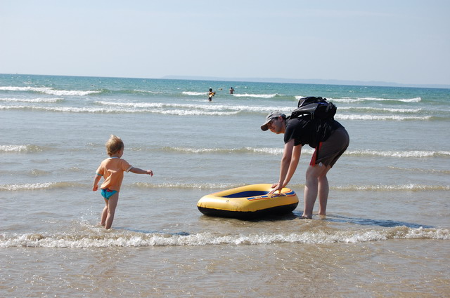 Le plus marrant : les vagues évidemment !! Tel un pacha, Kelyan se laisse porter par les remous et avec Tibo on se relaie pour tirer le fiston le plus vite possible :